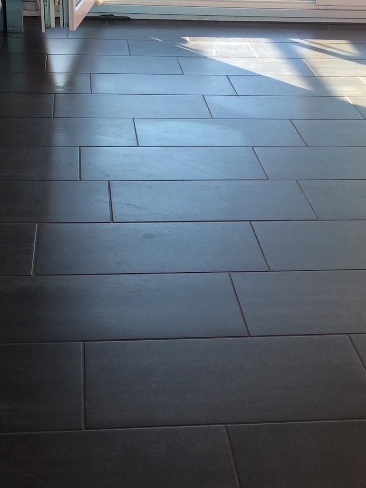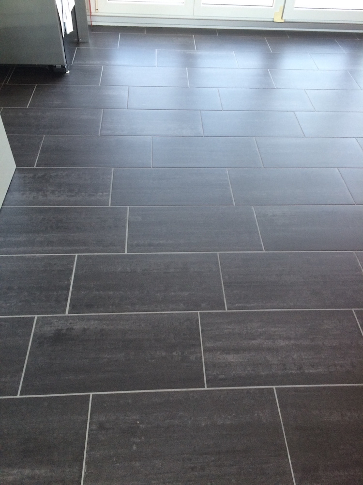 Da keine richtige Grundreinigung bzw. Zementschleierentfernung nach Fertigstellung der Feinsteinzeug-Bodenbeläge gemacht wurde, hat sich im Laufe der Zeit durch die Nutzung der Beläge nach und nach eine Schmutz- und Fettschicht auf dem hauchdünnen Zementschleier gebildet.